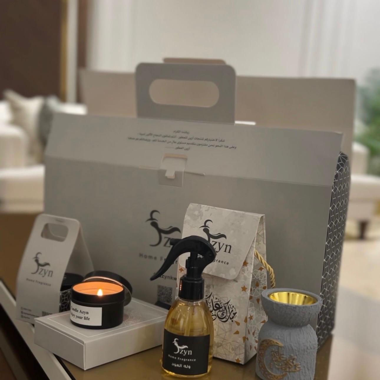 The set includes:1- 150ml spray bottle2- Incense burner3- Decorative candle4- Maamoul (date-filled cookie)5- Oud oil6- Gift card